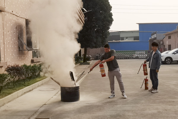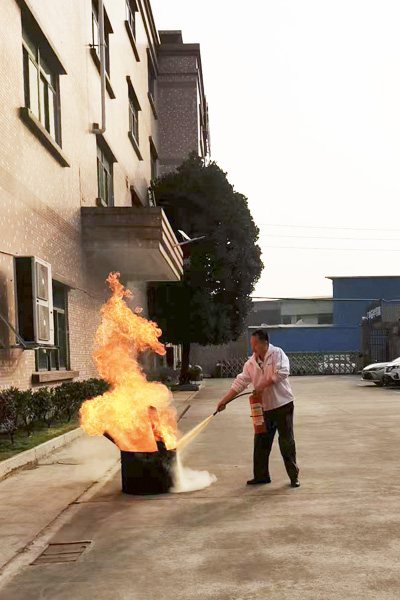 付經理講話結束以后,生產部張工對如何正確使用滅火器進行了示范教學。告訴大家如何使用。在使用時要站在上風口,離火源不要太近,以免火焰過大燙傷自己。